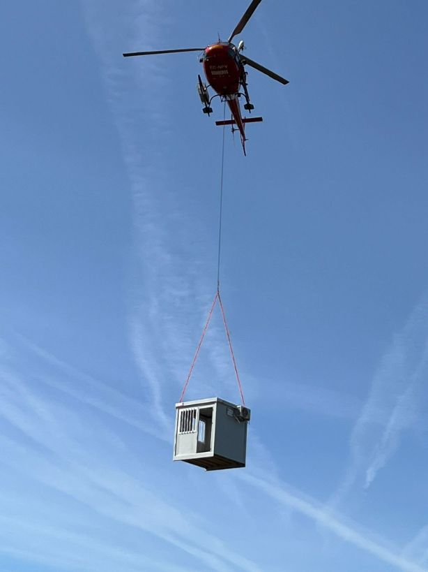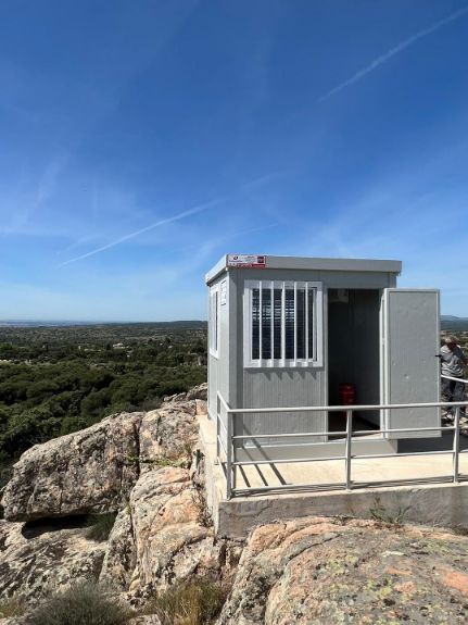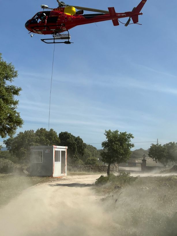 Con el fin de actuar ante cualquier situación de emergencia, los bomberos de la Comunidad de Madrid, nos han solicitado instalar el módulo en la zona mejor indicada para ello. Como se puede comprobar en las fotos, la entrega tuvo que realizarse de una forma especial, ya que necesitamos la ayuda de un helicóptero para instalarlo en su ubicación final.