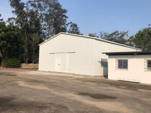 Los módulos se complementaron con una nave de 180m² basada en nuestro sistema de construcción prefabricada fija que también permite ser desmantelada y remontada en caso de reubicación. Para el cerramiento y cubierta a dos aguas se emplearon paneles sándwich de 80mm con aislamiento PUR. Se incluyeron elementos como puerta principal corredera, puertas peatonales con barra antipánico y ventanas correderas de aluminio.