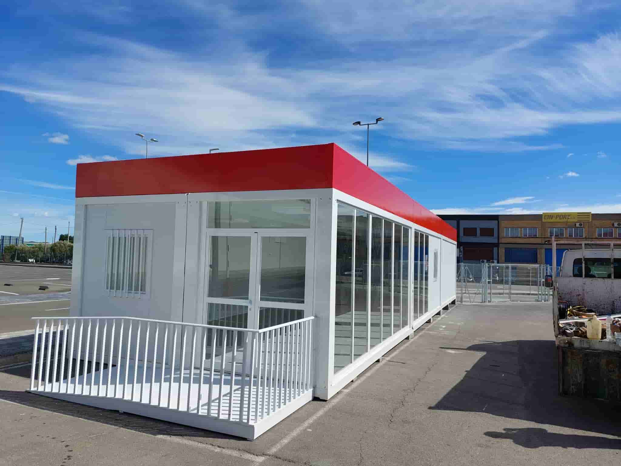 El conjunto está compuesto por 6 módulos prefabricados aislados y adosados, de 6,00 x 2,40mts cada uno. Dos de ellos tienen uno de sus frontales acristalados, permitiendo que entre más luz al establecimiento y pudiendo ser así una ventaja, tanto estética como comercial.