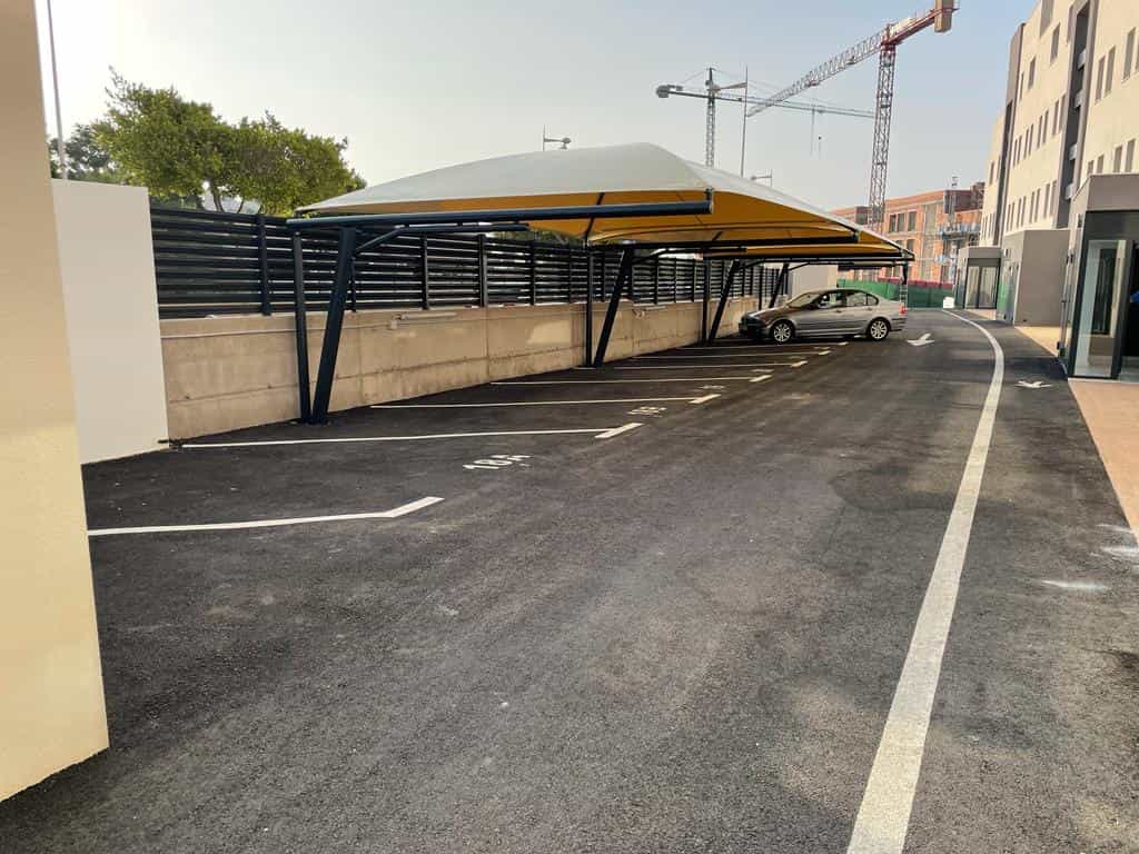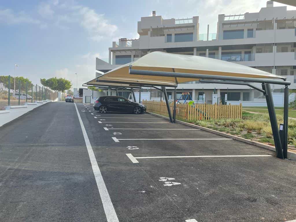 Una moderna marquesina textil ha sido instalada en una zona residencial de Toyo, Almería, ofreciendo 55 plazas de aparcamiento para coches con un diseño vanguardista.