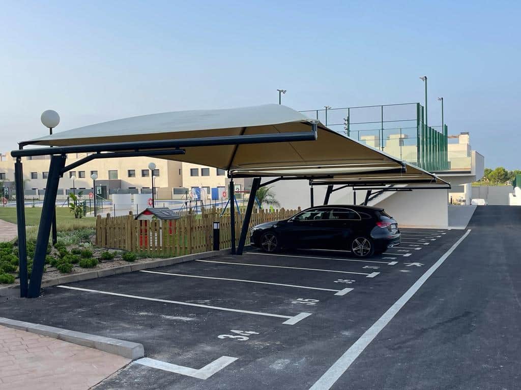 - Además, la estructura modular de la marquesina textil brinda la flexibilidad de adaptarse perfectamente a las necesidades específicas de la comunidad, ofreciendo una solución a medida que se ajusta de manera óptima al entorno residencial.