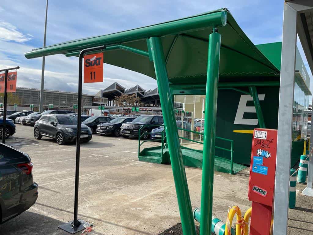- A pesar de que el 90% de los proyectos que realizamos son cubiertas para vehículos, en esta ocasión ha llegado a nuestras manos un trabajo diferente. Se trata de la instalación de una marquesina especial textil con una carpa para la cubrición de la zona de espera del módulo de alquiler de coches de Europcar. A partir de ahora, los viajeros que necesiten alquilar un coche cuando lleguen a Madrid, ya no tendrán que esperar a su tramitación a la intemperie, sufriendo el agotador sol y las altísimas temperaturas en verano ni la lluvia, el granizo, el viento o incluso la nieve del invierno. La empresa de alquiler de vehículos ha querido cuidar a sus clientes proporcionándoles un lugar donde resguardarse de las condiciones climáticas y ofreciéndoles un lugar más acogedor y agradable para hacer que su espera sea más amena y su visita a Madrid comience de la mejor manera posible.