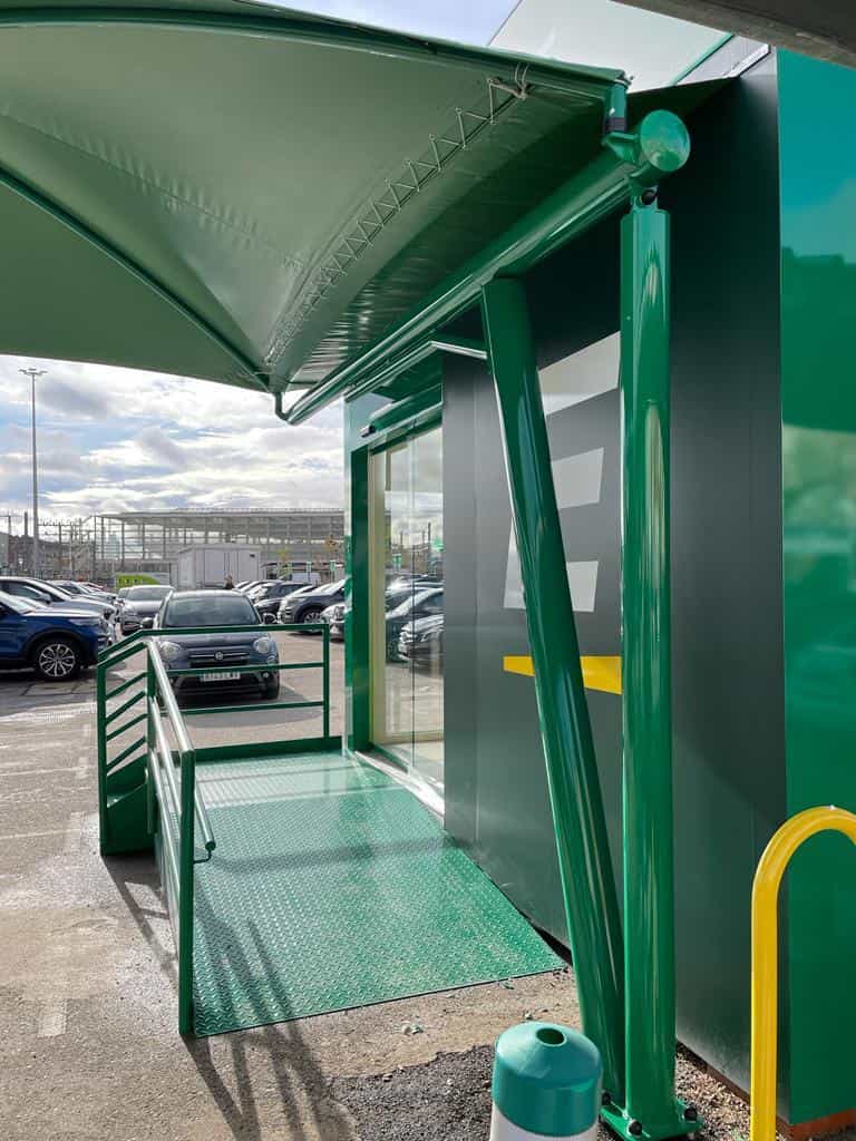- Tanto la cubierta como los pilares de esta marquesina han sido realizados en color verde a petición del cliente, combinando así con los colores corporativos de la empresa.