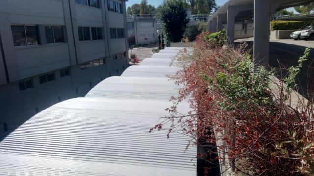 - Diseño especial de marquesina metálica con cubierta curva y estructura realizada mediante perfiles de acero plegados.