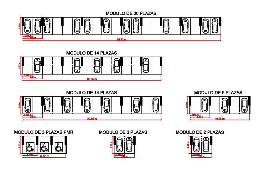 * Zona2: Se instalaron dos grupos de 2 plazas sencillas además de 1 grupo de 3 plazas PMR (Personas de Movilidad Reducida).