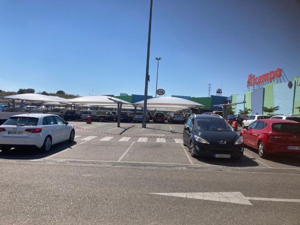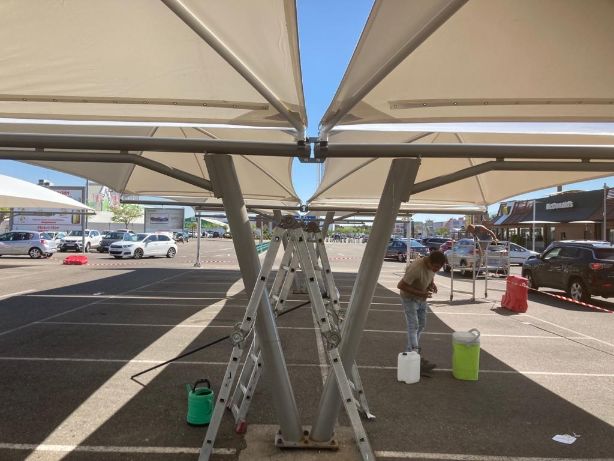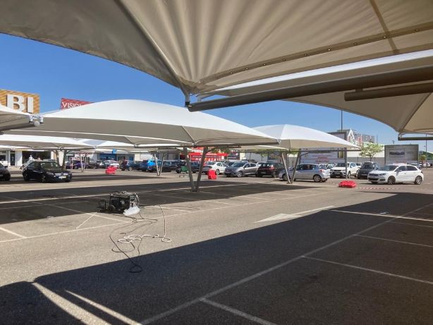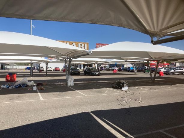 Es por ello que se ha optado por esta estructura en el parking del centro comercial Abadía. El montaje se va a realizar en diferentes fases. La primera fase de montaje: 232 plazas, divididas en 58 carpas de 4 plazas cada una.