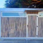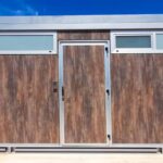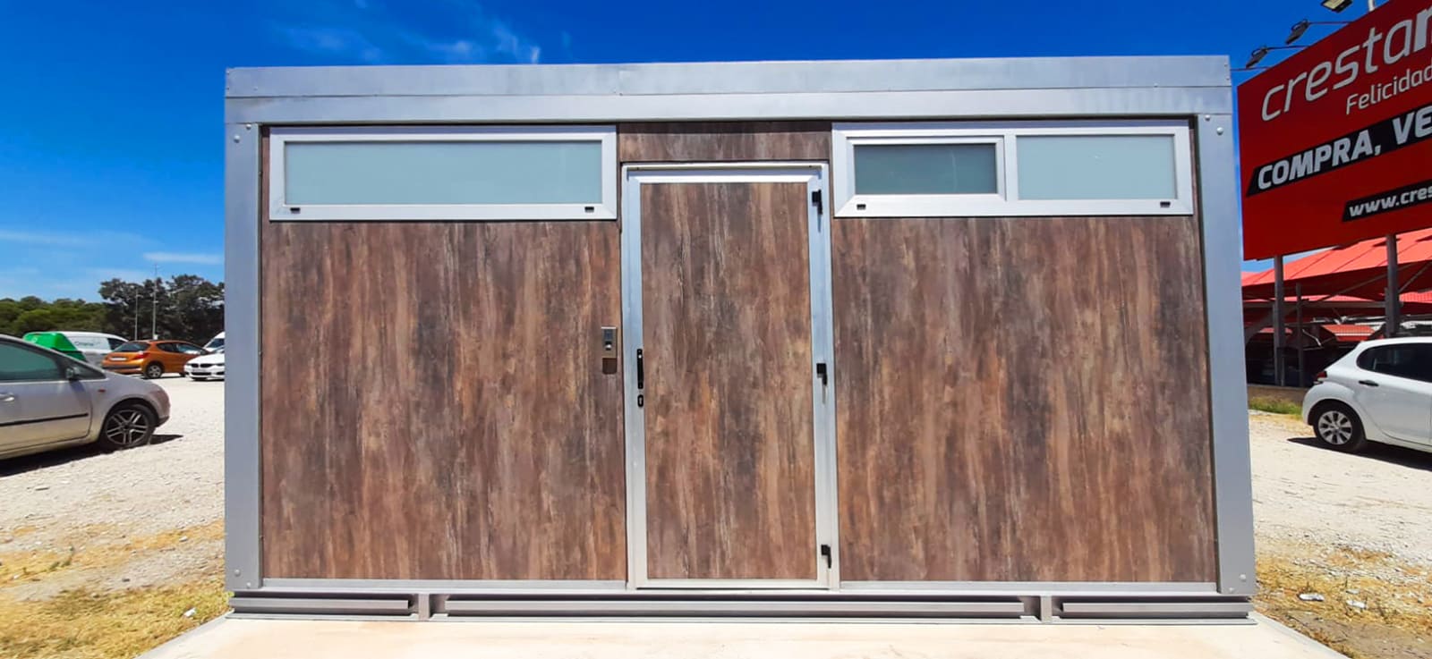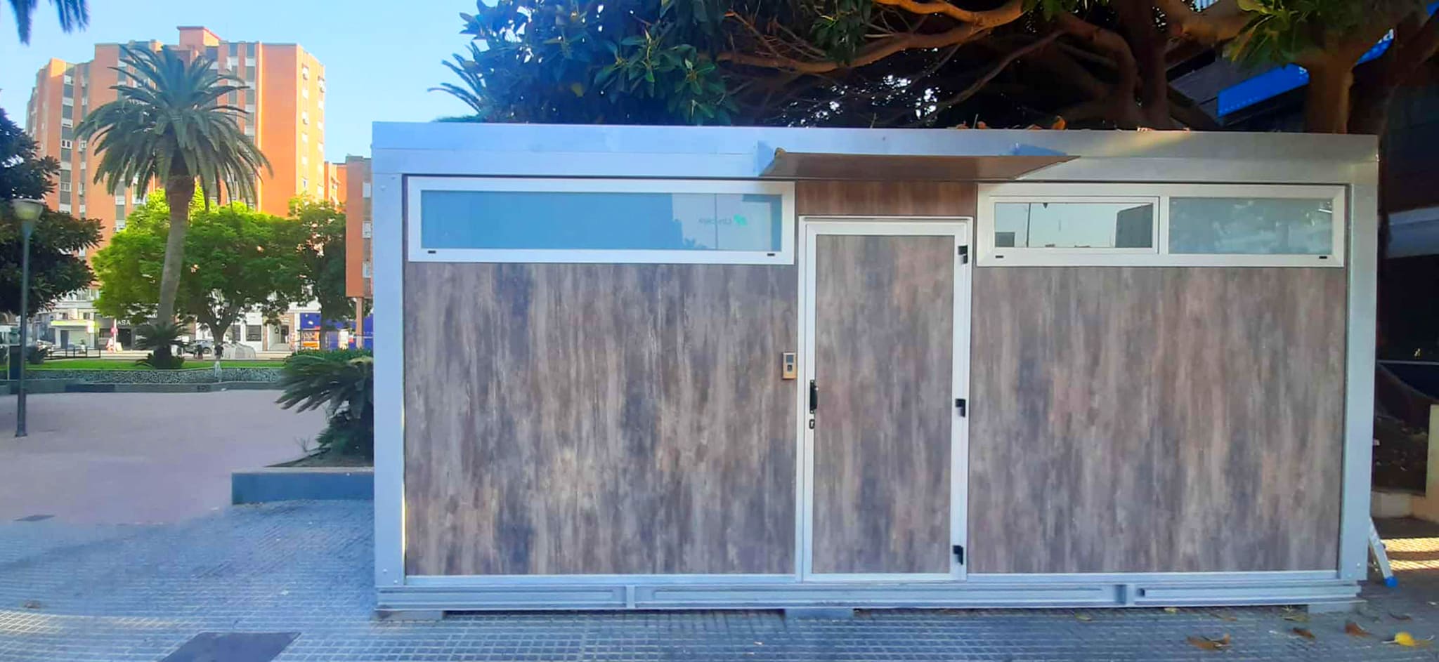 Revestimiento exterior: paneles laminados de alta presión (HPL exterior ref. 0192, efecto madera) o material similar de 10 mm. Este acabado aporta un aspecto cálido y natural, ideal para integrarse en cualquier entorno, desde instalaciones industriales hasta espacios educativos o comerciales.