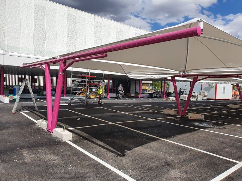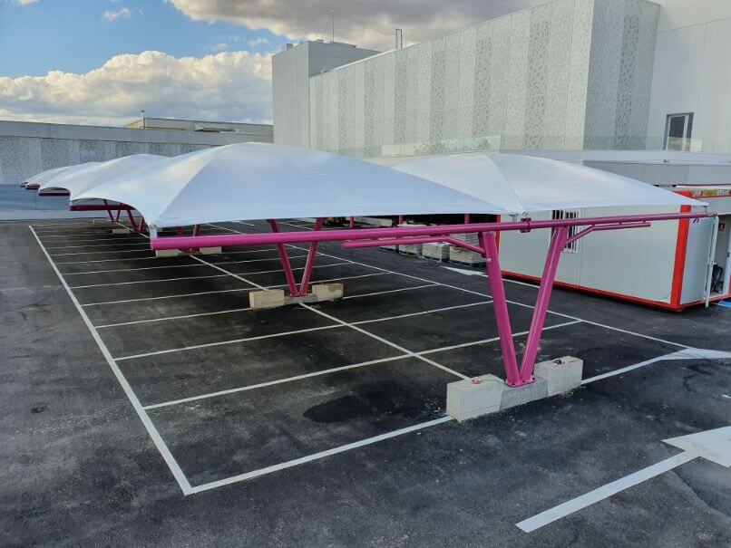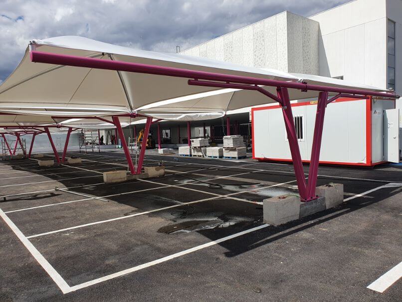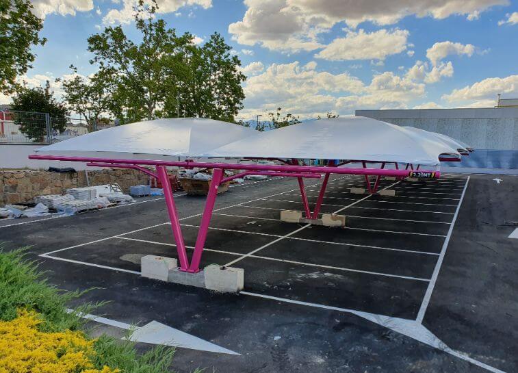 La cubierta por la que se ha optado en esta ocasión es modelo textil, la más estética de nuestras marquesinas, sin olvidar la seguridad y la calidad de los materiales empleados en su fabricación y montaje. Son estructuras modulares adaptables a la geometría del lugar. Su versatilidad va más allá de la utilidad como marquesinas de aparcamiento de vehículos, también pueden ser utilizadas en terrazas o jardines como zonas de sombra, en negocios exteriores como áreas de espera, protección de materiales, etc… una innovadora arquitectura textil para múltiples aplicaciones con modernos y elegantes diseños.