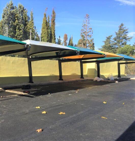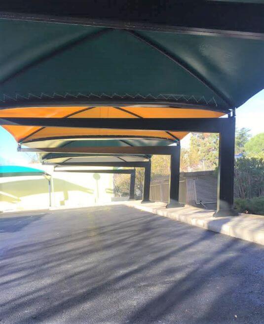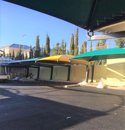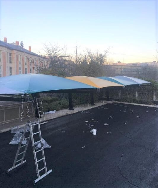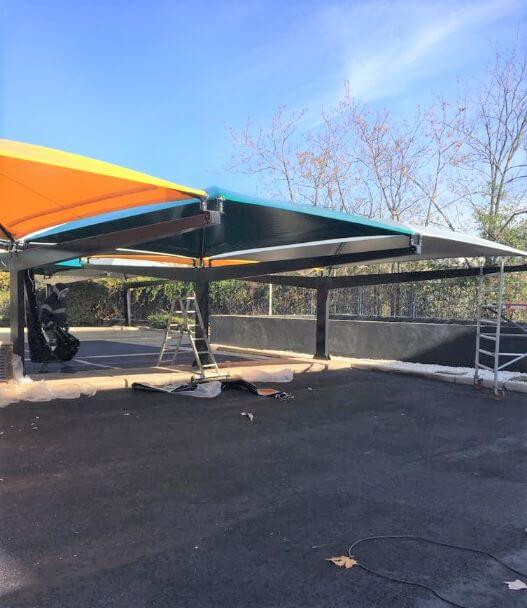 En este nuevo proyecto hemos realizado el desmontaje de una cubierta metálica ya existente y sustituida por una marquesina con cubierta textil.