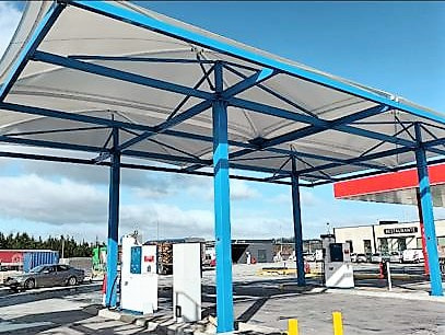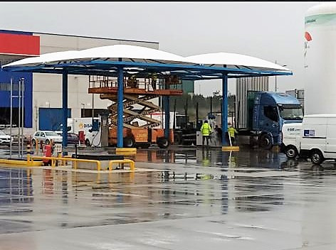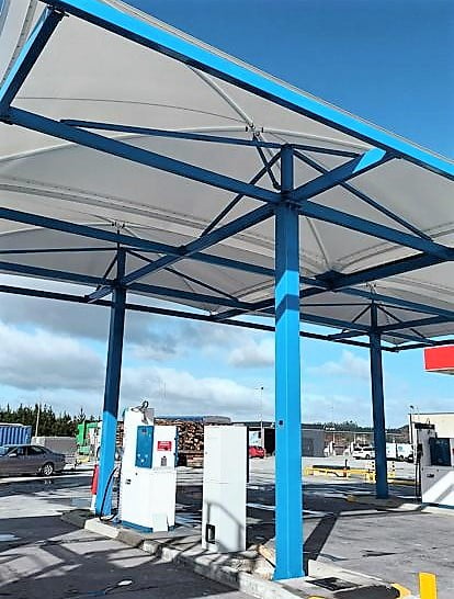 El equipo de Europa Prefabri ha terminado el montaje de nuevas Marquesinas Mecánico Textiles para gasolinera ubicada en la ciudad de Santiago de Compostela.