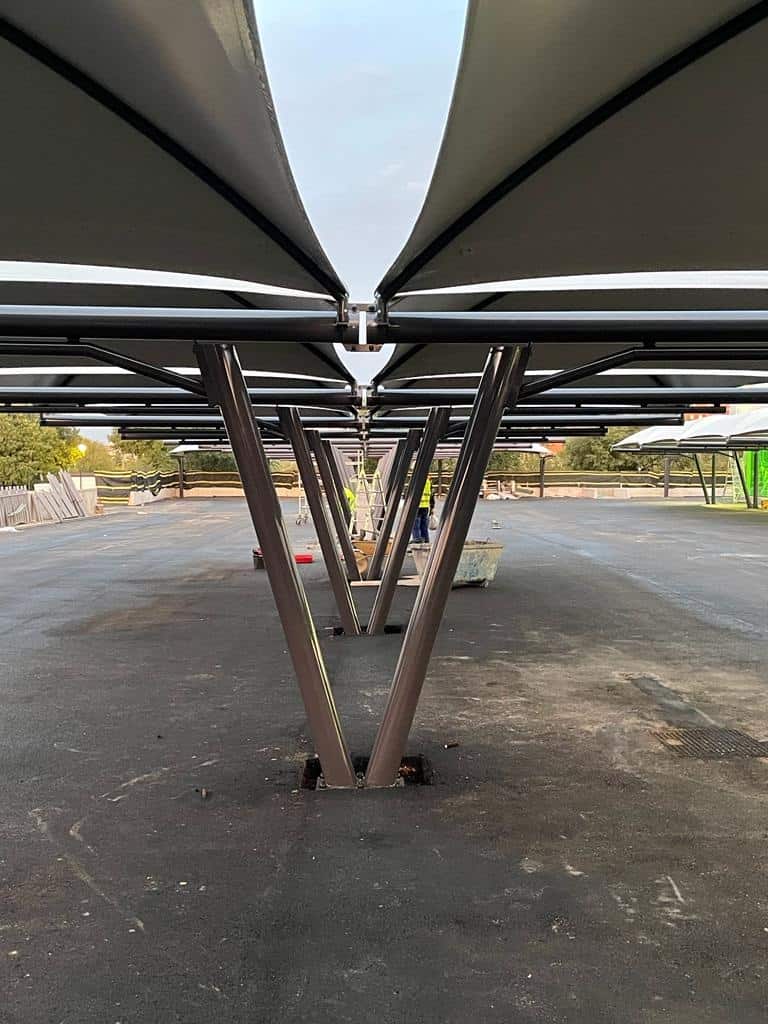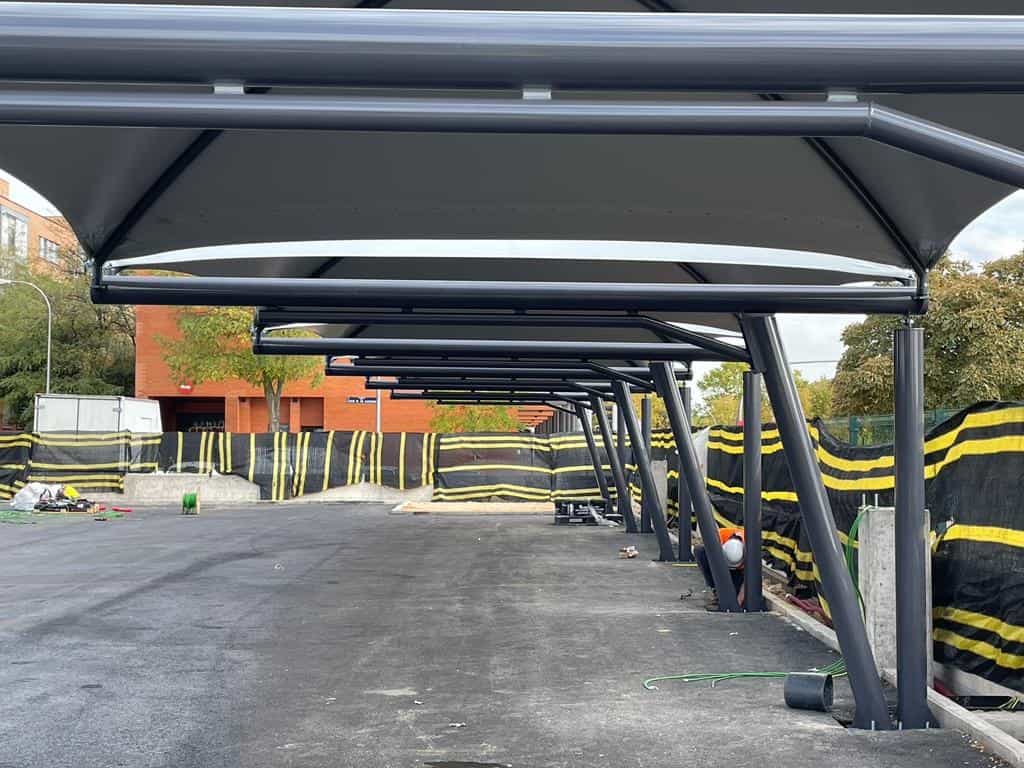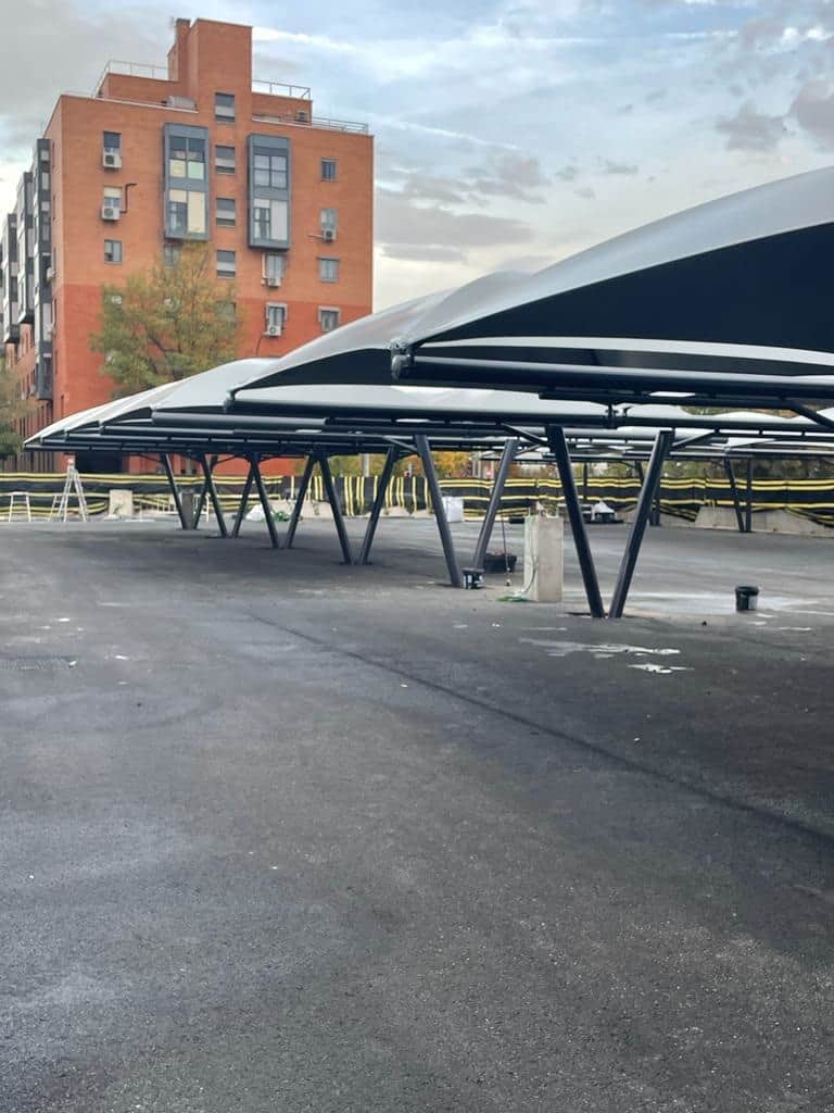- Las 92 plazas de aparcamiento instaladas se localizan distribuidas en cinco grupos de marquesinas sencillas y 2 grupos de marquesinas dobles.