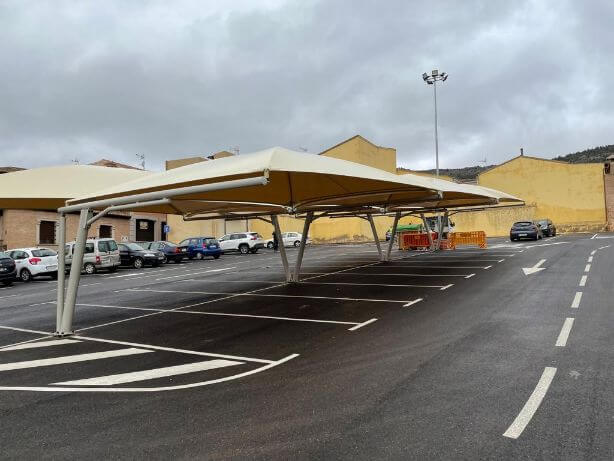 La cubierta por la que se ha optado en esta ocasión es modelo textil, la más estética de nuestras marquesinas, sin olvidar la seguridad y la calidad de los materiales empleados en su fabricación y montaje. Son estructuras modulares adaptables a la geometría del lugar. Su versatilidad va más allá de la utilidad como marquesinas de aparcamiento de vehículos, también pueden ser utilizadas en terrazas o jardines como zonas de sombra, en negocios exteriores como áreas /?p=2413de espera, protección de materiales, etc… una innovadora arquitectura textil para múltiples aplicaciones con modernos y elegantes diseños.