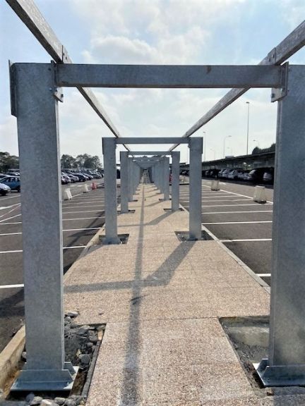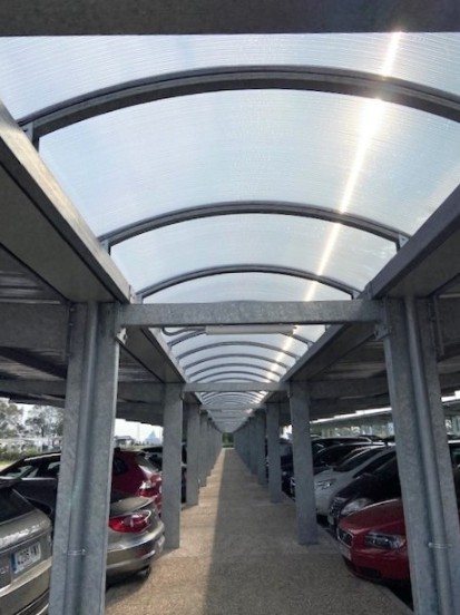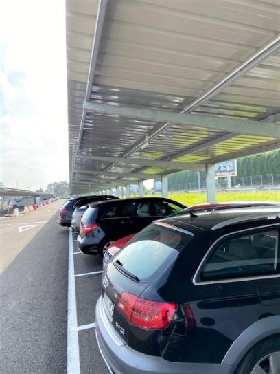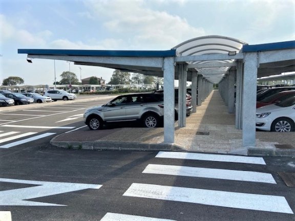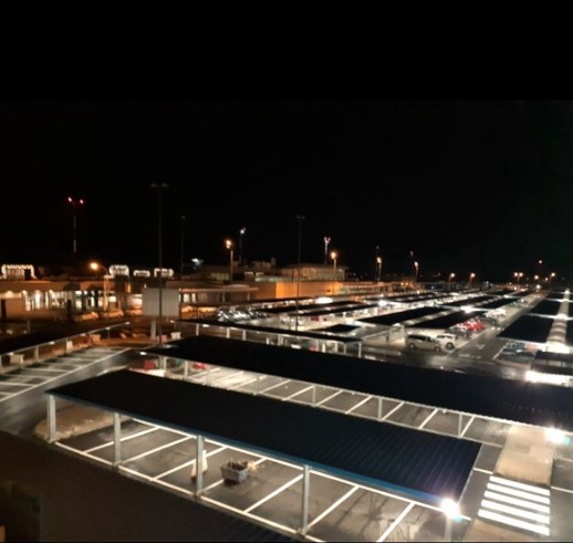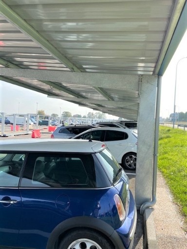 Realizamos el diseño y la instalación de 1.200 marquesinas de parking para el Aeropuerto de San Javier, en Murcia, del modelo OLA, requeridas por el cliente.