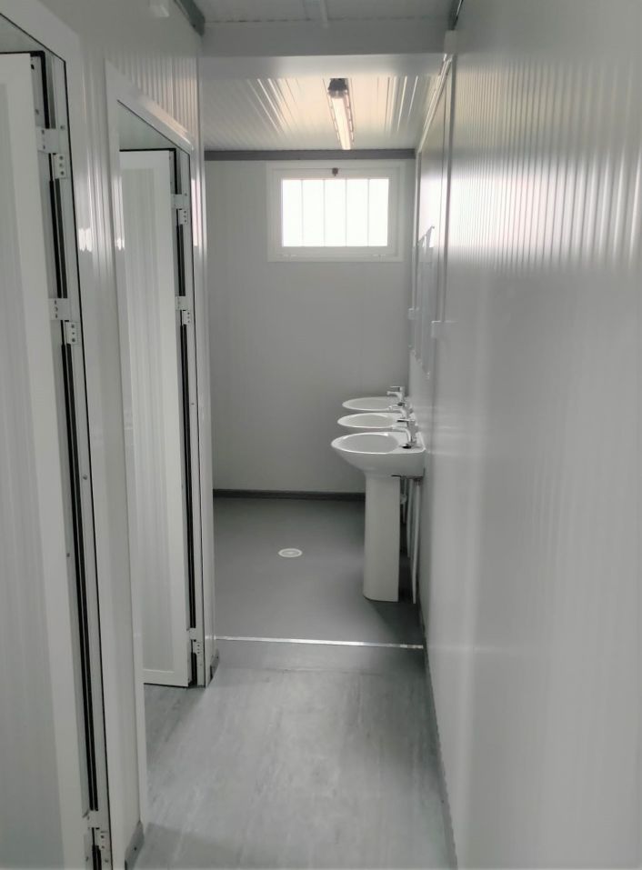 El espacio modular se entregó completo y listo para su uso, incluyendo termos de agua caliente de gran capacidad, extintores y luces de emergencia, accesorios para papel higiénico en los aseos, además de espejos, toalleros, cortinas de duchas y secamanos automáticos.