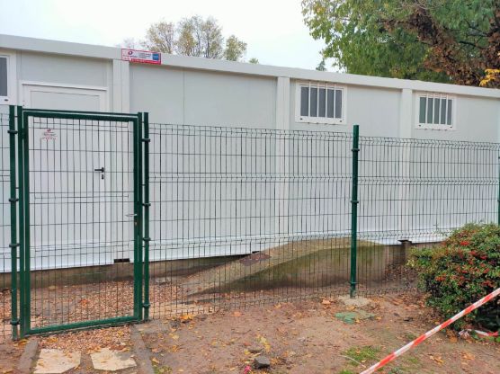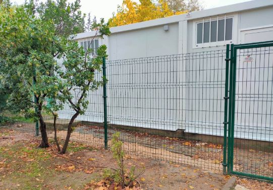 La rápida implantación del espacio modular se ha rematado con la colocación, como elemento de seguridad, de un cerramiento perimetral con valla rígida electrosoldada con postes metálicos, todo ellos con recubrimiento plastificado en poliéster, incluida puerta abatible con cerradura de seguridad.