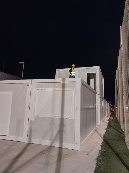 Instalación de vestuarios modulares polivalentes para equipos de fútbol (local y visitante) y equipo arbitral en Barcelona.