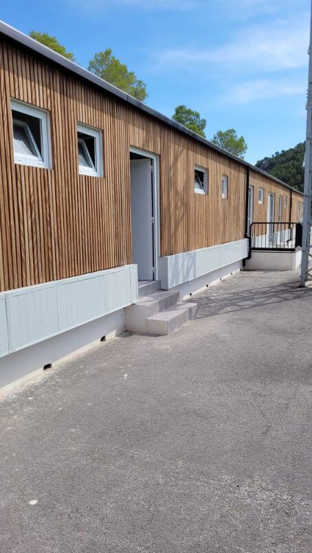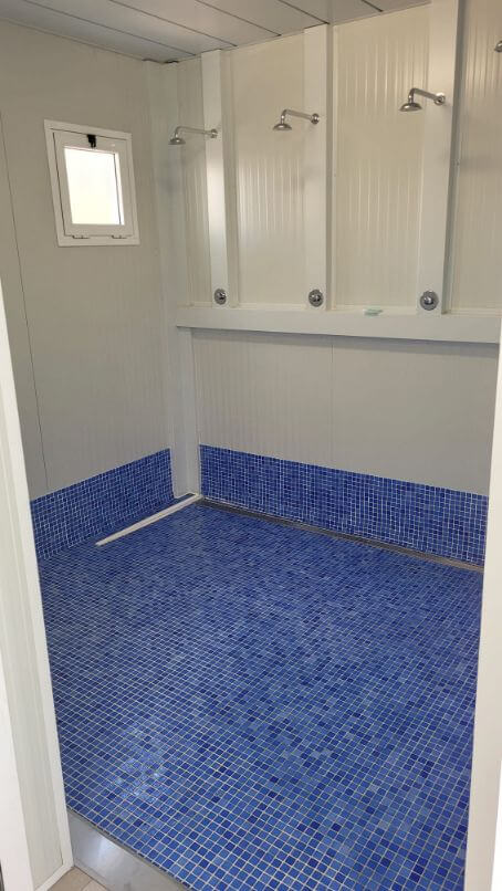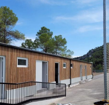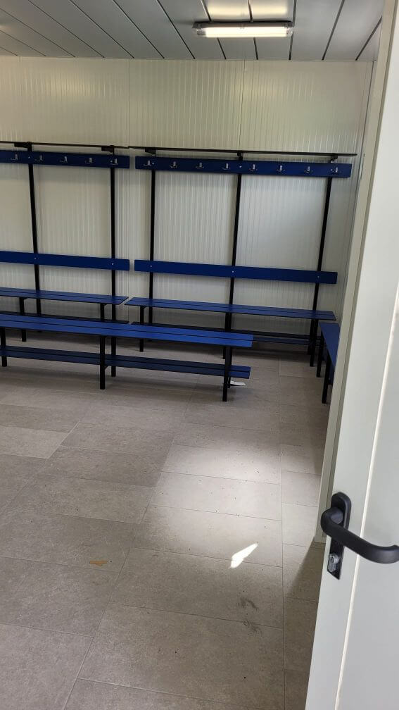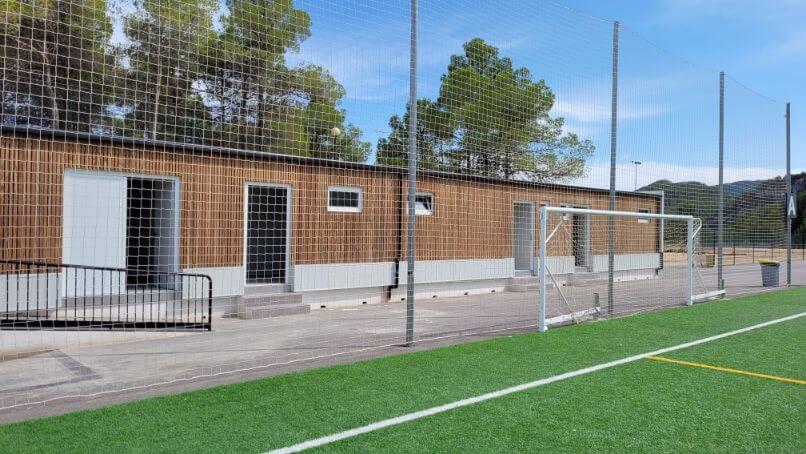 Proyecto especial “llave en mano” de vestuarios prefabricados que forman un espacio modular unificado, que incluye vestuarios y aseos completos para 4 equipos, vestuario y aseo completo para el equipo arbitral, aseos independientes y almacén, incluidos aseos, accesos y elementos adaptados conforme a normativa.