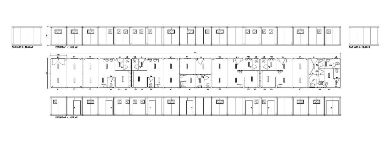 - El conjunto modular está formado por 18 módulos prefabricados de dimensiones exteriores (largo x ancho x alto) 4.400 x 2.350 x 2.800 mm, con una superficie construida de 10,34 m² y una altura interior libre de 2.500 mm.